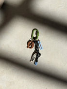 Este charm combina un diseño moderno y aventurero. Incluye un mosquetón verde, un cordón negro con detalles en gris, y tres accesorios: la Ø carácteristica de MILØ en tono café, una placa celeste con la palabra Uruguay, y un pez estilizado. Es un accesorio ligero, original y con un toque outdoor, perfecto para quienes buscan algo práctico pero con personalidad.